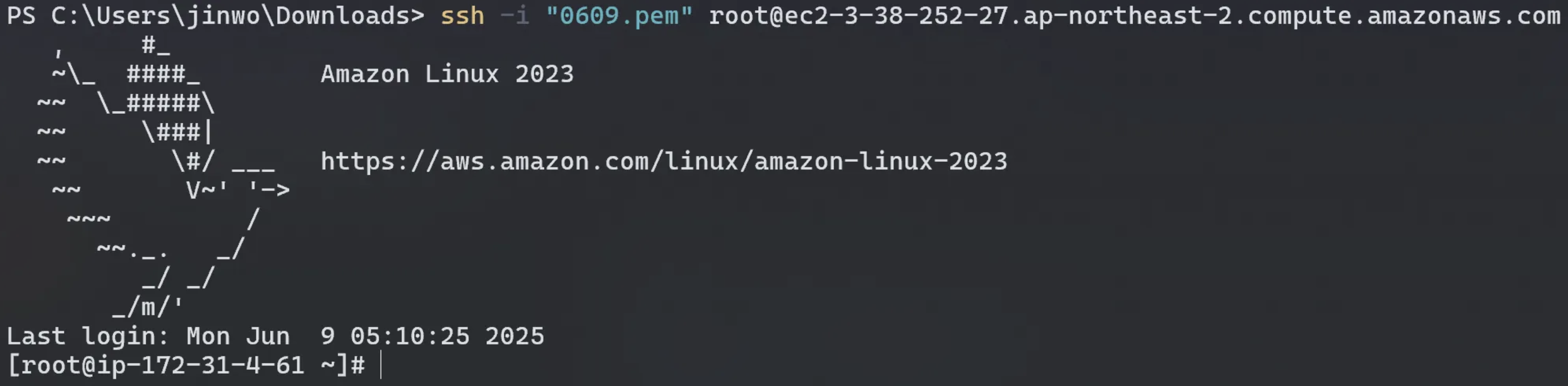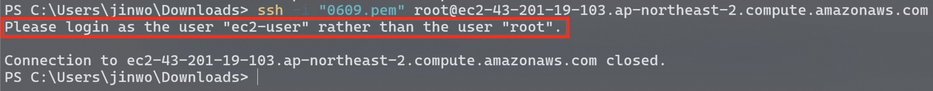 현재 아래와 같이 생성한 아마존 리눅스 2023 EC2 서버에 root 유저로 접속하려고 하면 아래와 같은 문제가 발생합니다.