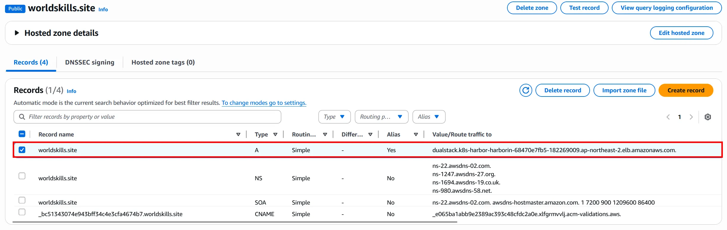 Harbor 콘솔에서 작업 하기 이전에 아래의 사진과 같이 생성된 Route53에서 레코드를 구성해줘야 합니다.