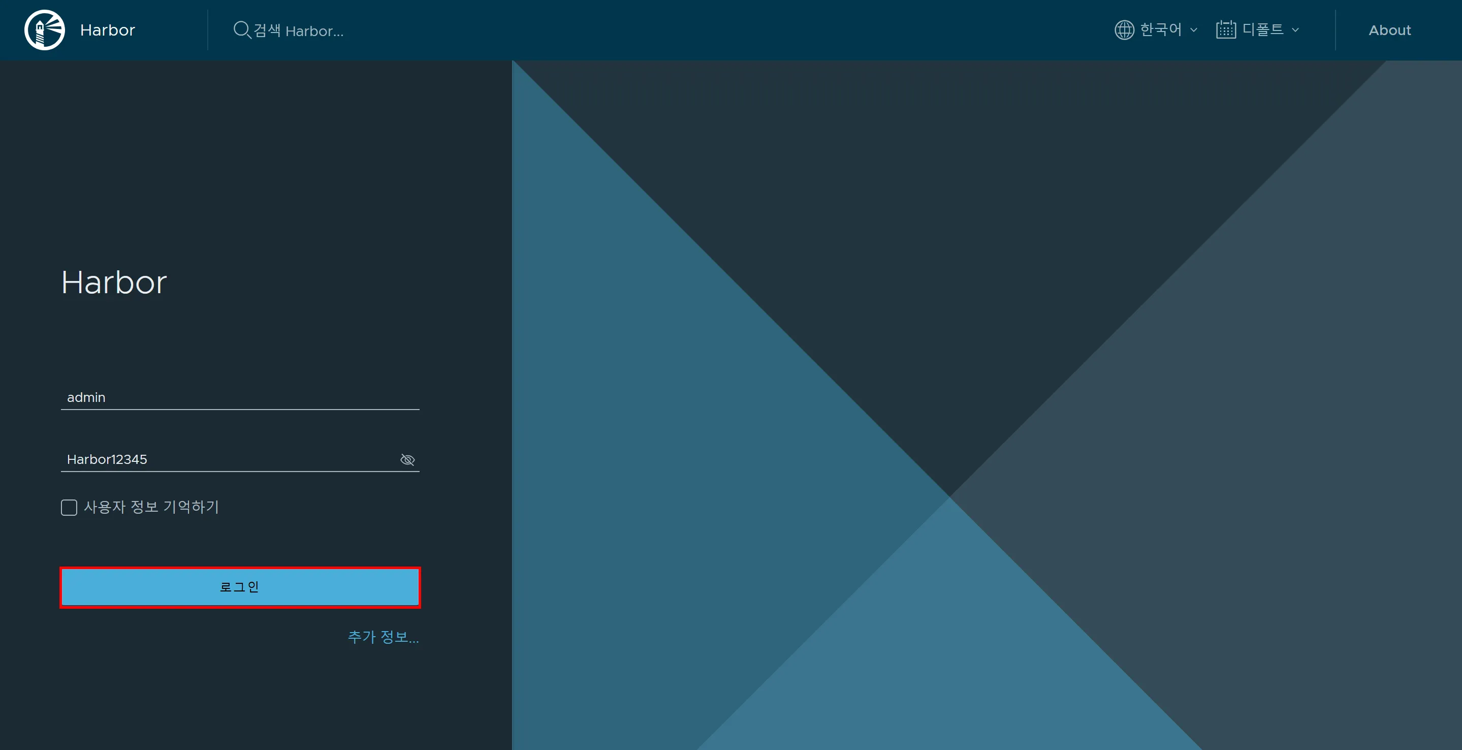 이제 아래의 사진과 같이 생성된 ALB에 접근을 하면 Harbor 로그인 화면이 뜨게 됩니다. (기본값은 admin / Harbor12345 입니다.)