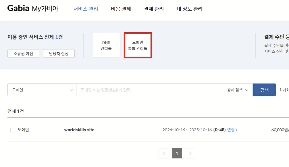 정보를 확인 후 가비아 도메인 통합 관리툴을 선택해줍니다.