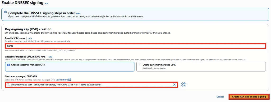 아래의 사진처럼 Provide KSK name은 name으로 입력 후 생성했던 KMS를 선택 및 Create를 해줍니다.
