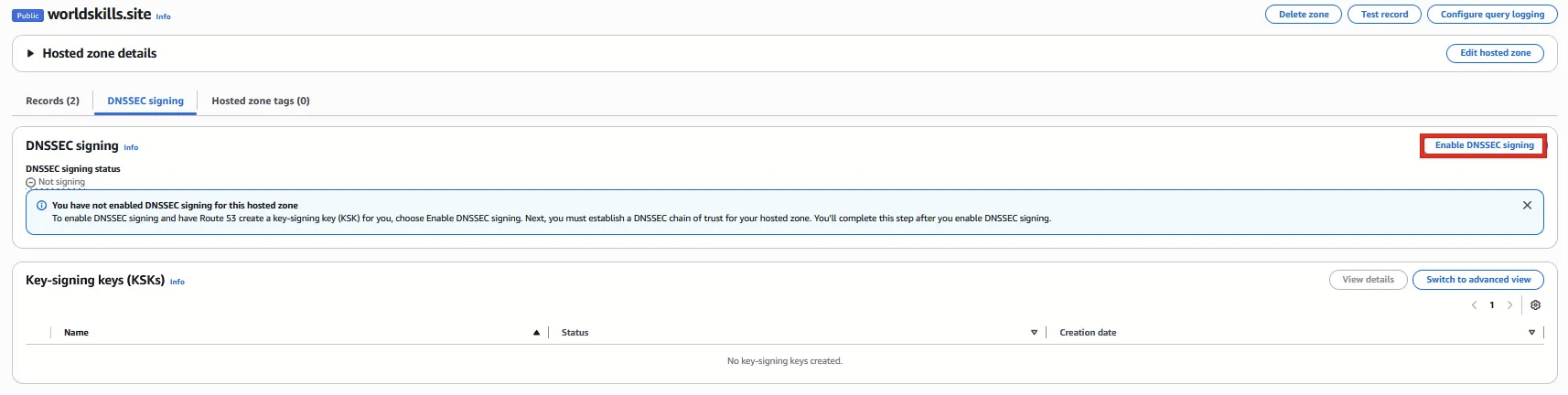 다시 Route53 으로 돌아와 DNSSEC signing 메뉴에서 Enable DNSSEC을 선택해줍니다.